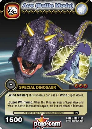In Battle at the Pyramids, his card, along with Cyclone (and Paris), was found in Alberta, Canada, by Dr. Owen at a fossil dig, and was immediately shipped to the D-Lab. He was first summoned by Rex after teleporting to Egypt to help Max and Chomp fight the Alpha Gang and wild Spinosaurus (now under their control); he managed to defeat Spiny with Cyclone. He was called "Ace" because it means "number one", and he was Rex's first dinosaur. His chibi form was introduced to Mrs. Taylor as a "dog", and he lived in Max's house with Rex.