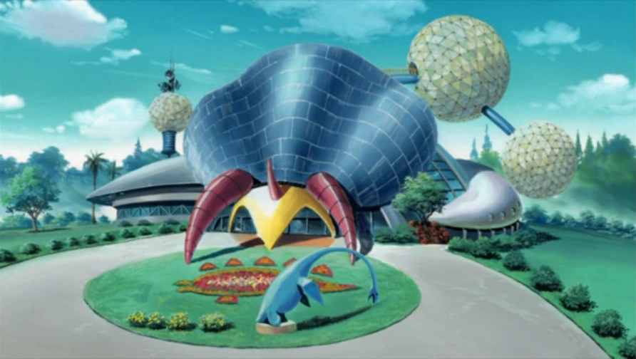 It is located on a hilltop overlooking Sanjo City, Japan. The appearance of the D-lab is based mostly on prehistoric things, the front being based on a ceratopsian head (seemingly Triceratops), and featuring a plesiosaur statue outside near a small flower patch shaped like a stegosaur. Inside the building there are paintings of dinosaurs and lots of fossils, including three giant fossils of a Tyrannosaurus, Placerias, and a Tupuxuara. Many of the devices, like the display screens, are also dinosaur-themed in aesthetic, and stylized theropod footprints are stamped all over.