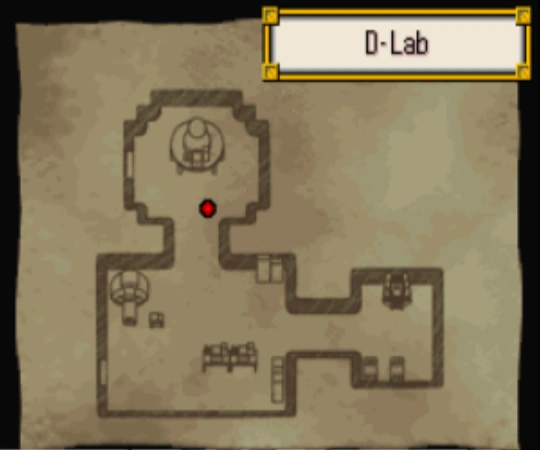 With a rather simple exterior design still featuring what appears to be minimalist stegosaur plates, the D-Lab is run by Reese Drake with help from Dr. Taylor; unlike the anime, there are a host of unnamed scientists and researchers who aid in its operation. Inside is rather sparse with several bookcases, computer desks, some scientific machinery, a Teleporter, and Reese's computer station with a large floating globe. The D-Lab is a hub of dinosaur research and fossil digs and expeditions, managing to uncover two Stones and a Stone Fragment prior to the story, allowing the creation of the DinoShots by Reese to summon dinosaur cards created from revived fossils. While not actually a part of it, various D-Sites across the world work in partnership with the D-Lab, but are headed by other individual owners. While its location is never specified, its teleporter mark being a name tag box in the corner of the map, it is likely in Japan like in the anime. Being a peaceful location, its interior map is unlocked by default, and no drilling spots spawn.
