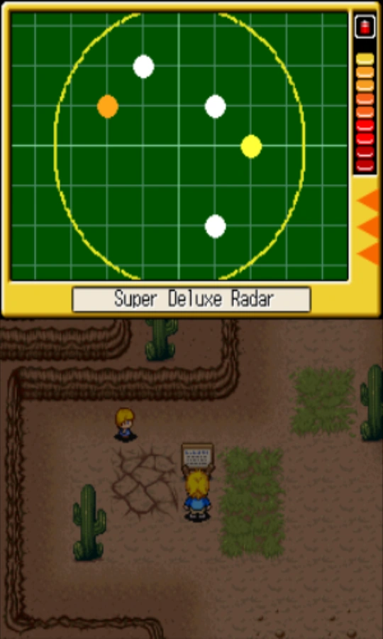 As explained by the Master Excavator's unskippable tutorial, pressing R opens the current Radar in the top screen and A uses one of the ten charges to scan the surrounding spaces for buried items (with the range of a 5x5 box covering 2 steps in each cardinal direction), which appear as colored pings on the display (one grid space is one step); B closes the Radar (pressing A again will just use it over the same area again, only useful if you forgot where the pings were) and L takes out the current Drill, A triggering the infinite-use Drill where the player is standing. The player is prompted to take out the Drill immediately after if they are standing over an item when they scan; tapping the lower screen can substitute pressing A at any step; and the Radar can be recharged by either buyable Battery items or by entering a D-Site. Reminders of "L-Drill" and "Radar-R" are again displayed on the top screen if the player stands still for several seconds at any later point during the game except in cutscenes. Any objects that vanish when the Drill is taken out, including but not limited to NPCs and item cases, may be inconveniently located over top of item spawns, making them unobtainable.