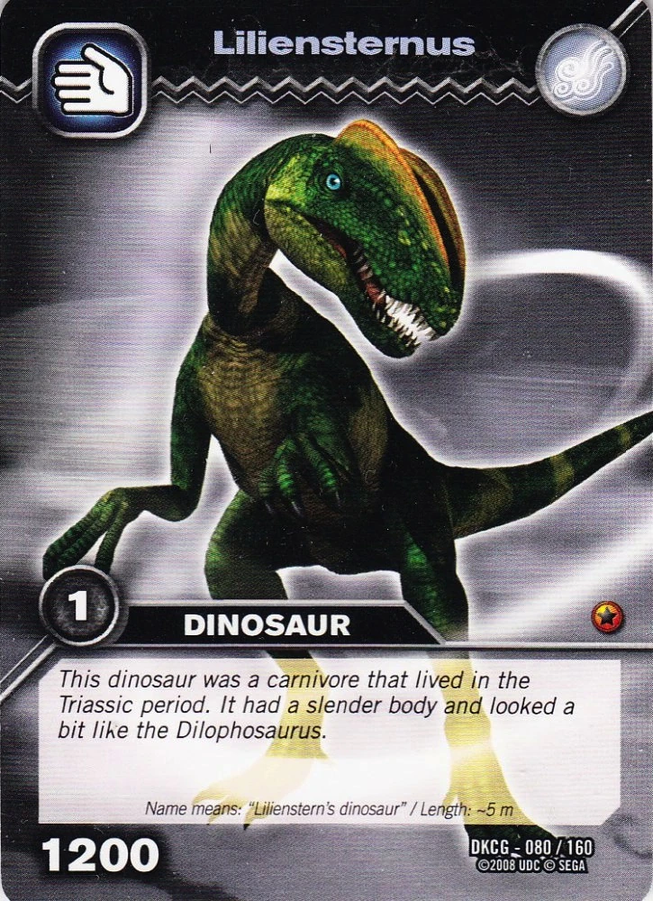 - English: A carnivore from the period before the Jurassic. It has a sleek body and features that resemble the Dilophosaurus.