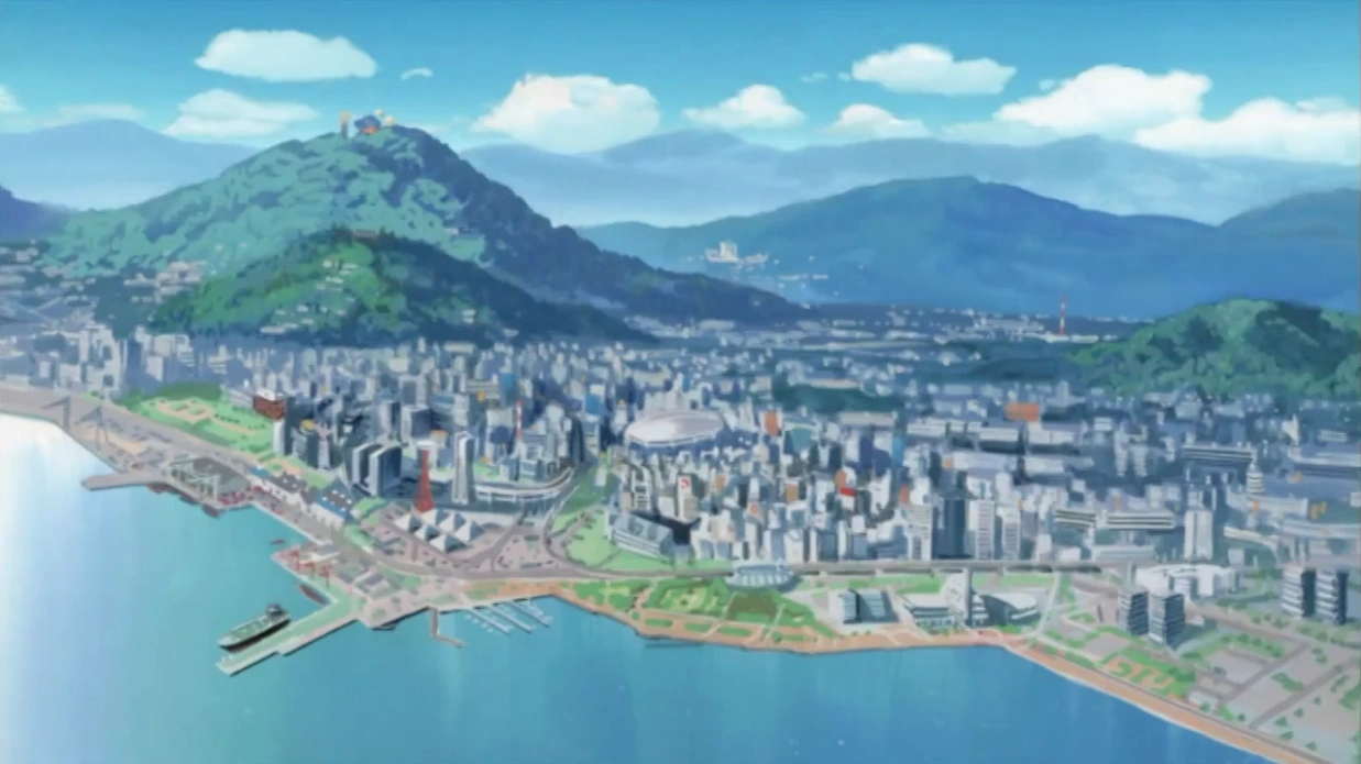 Sanjo City establishing shot (D-Lab seen up on hill)